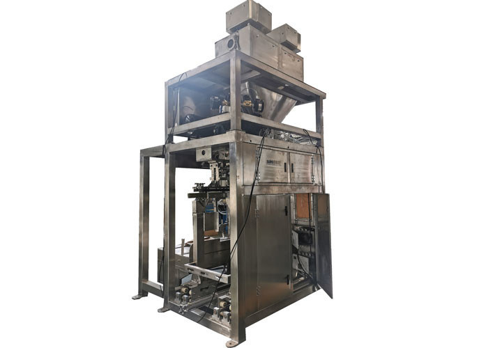 Bei Produktion verwirklicht es die volle Automatisierung der Taschenversorgung, des Taschennehmens, der Taschenöffnung, des Taschenbauschens, des Messens, der Füllung, die Tasche, die entlädt und klemmt die Formung, das Falten und das Versiegeln, etc. fest.